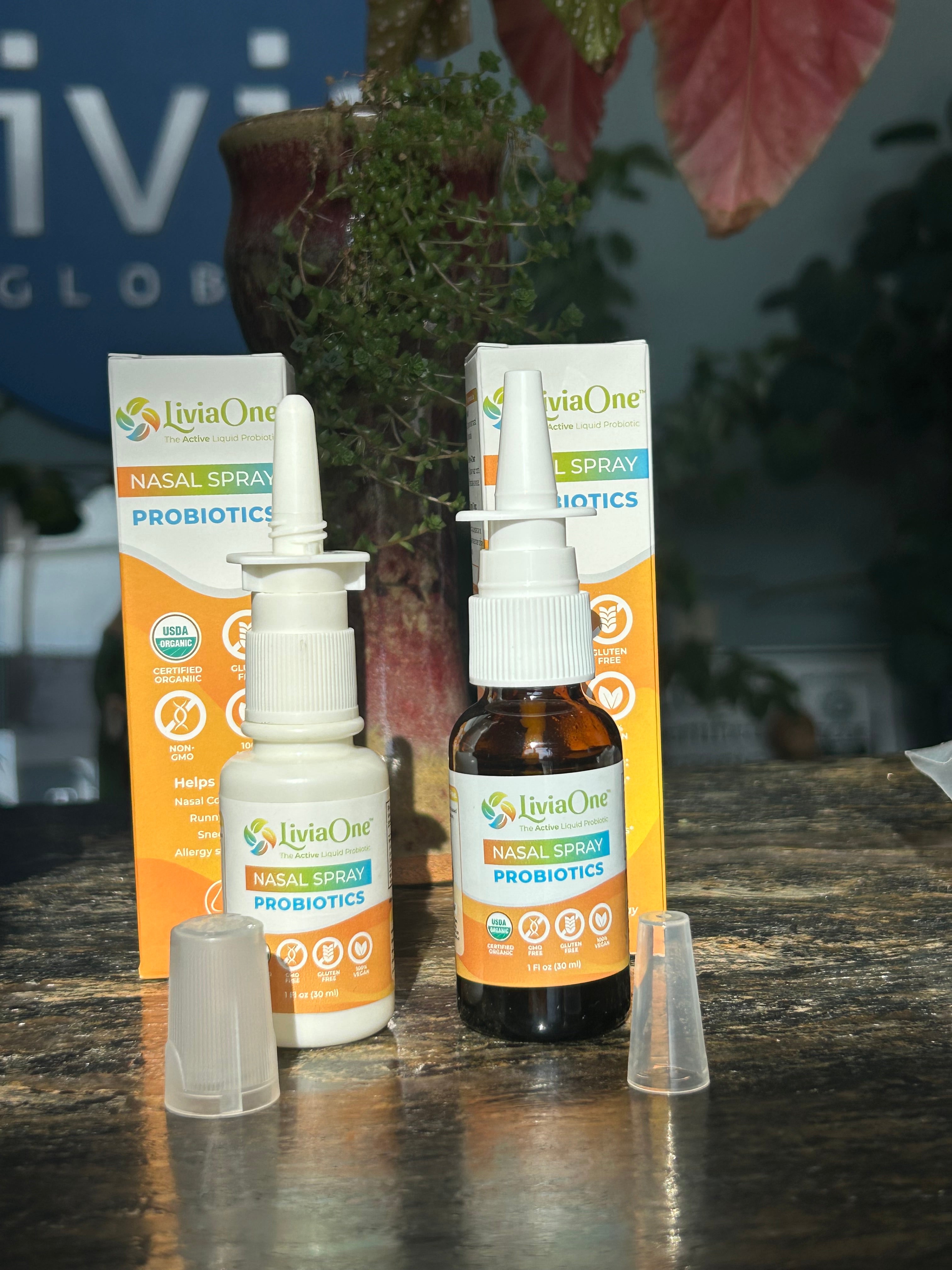 LiviaOne™ Probiotics Nasal Spray is a safe all-natural plant-based probiotic spray that helps aide nasal congestion, running nose, and other irritants. (1 ounce (30 ml) spray bottle.)